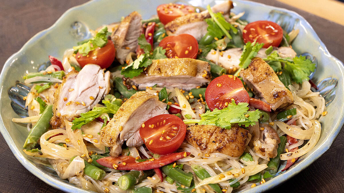 Теперь пришло время объединить все ингредиенты: к овощной смеси добавьте фунчозу и куриное мясо, нарезанное небольшими кусочками. Тщательно перемешайте, выложите на тарелку и украсьте половинками томатов черри и любимой зеленью. Приятного аппетита!