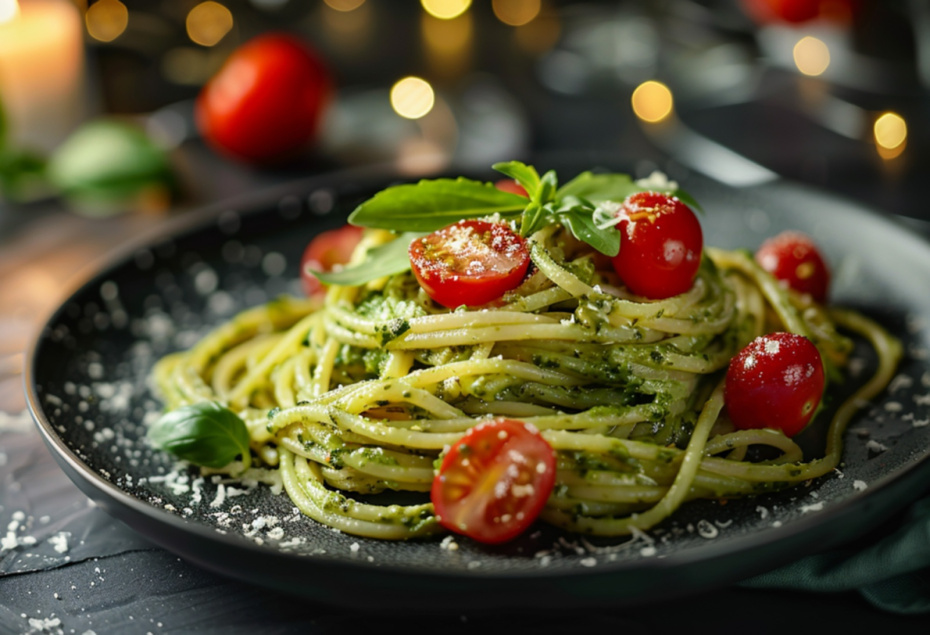 Все ингредиенты измельчаются до получения однородной массы. Отварите 200 г спагетти до состояния аль денте, затем смешайте пасту с вашим песто. Для акцента добавьте вишневые помидоры и щепотку черного перца. Всего одна порция этого восхитительного угощения содержит всего 450 калорий.