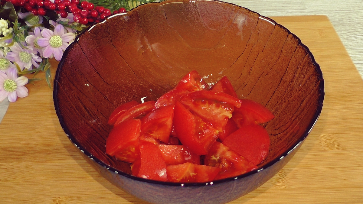 Приступаем к приготовлению. Нарежьте все ингредиенты для салата. Сперва помидоры можно нарезать произвольно, но не слишком мелко. В случае кислых плодов добавьте щепотку сахара для улучшения вкуса.