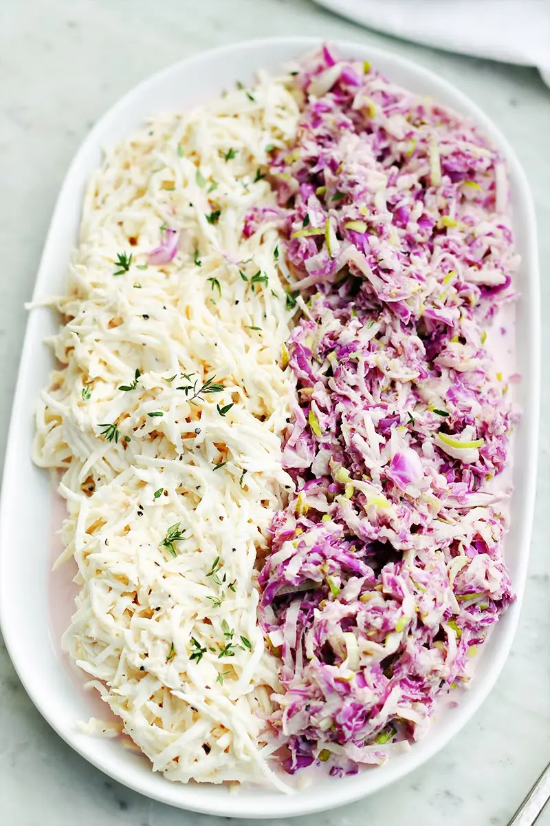Сегодня в меню — удивительные салаты: один с корнем сельдерея, а другой с краснокочанной капустой. Эти угощения идеально сочетаются с жареной картошкой или могут стать отличной начинкой для шаурмы с курицей или сосиской.
