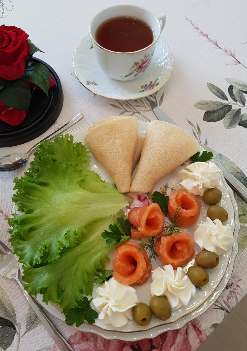 После суток ожидания сёмга готова к употреблению. Нарежьте её аккуратными пластиками, придавая каждому кусочку форму розочки. Прекрасно сочетается с блинами, листьями свежего салата, творожным сыром, оливками и зеленью — укропом и петрушкой. Это неповторимое сочетание станет не только блюдом, но и настоящим украшением праздничного стола.