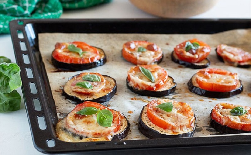 Разогрейте духовку до 200 °C и запекайте баклажаны в течение 10 минут для того, чтобы они стали мягче, но сохранили свою форму. Тем временем нарежьте помидоры и кубиками сыр, ведь они придадут блюду насыщенности. По окончании первой части запекания на каждый ломтик баклажана положите томат и сыр, не бойтесь экспериментировать с толщиной.