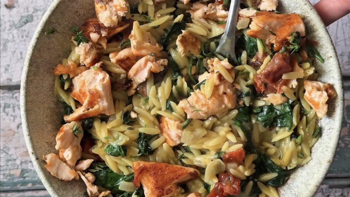 Порой стоит остановиться, расслабиться и насладиться тёплым и сливочным блюдом. Сливочное орзо с вялеными томатами, шпинатом и лососем - это именно то, что нужно. Его нежная текстура, солоноватый пармезан и яркие вяленые томаты создают идеальное сочетание вкусов. Ужин для себя или на двоих в таком исполнении станет настоящим кулинарным наслаждением.
