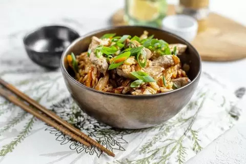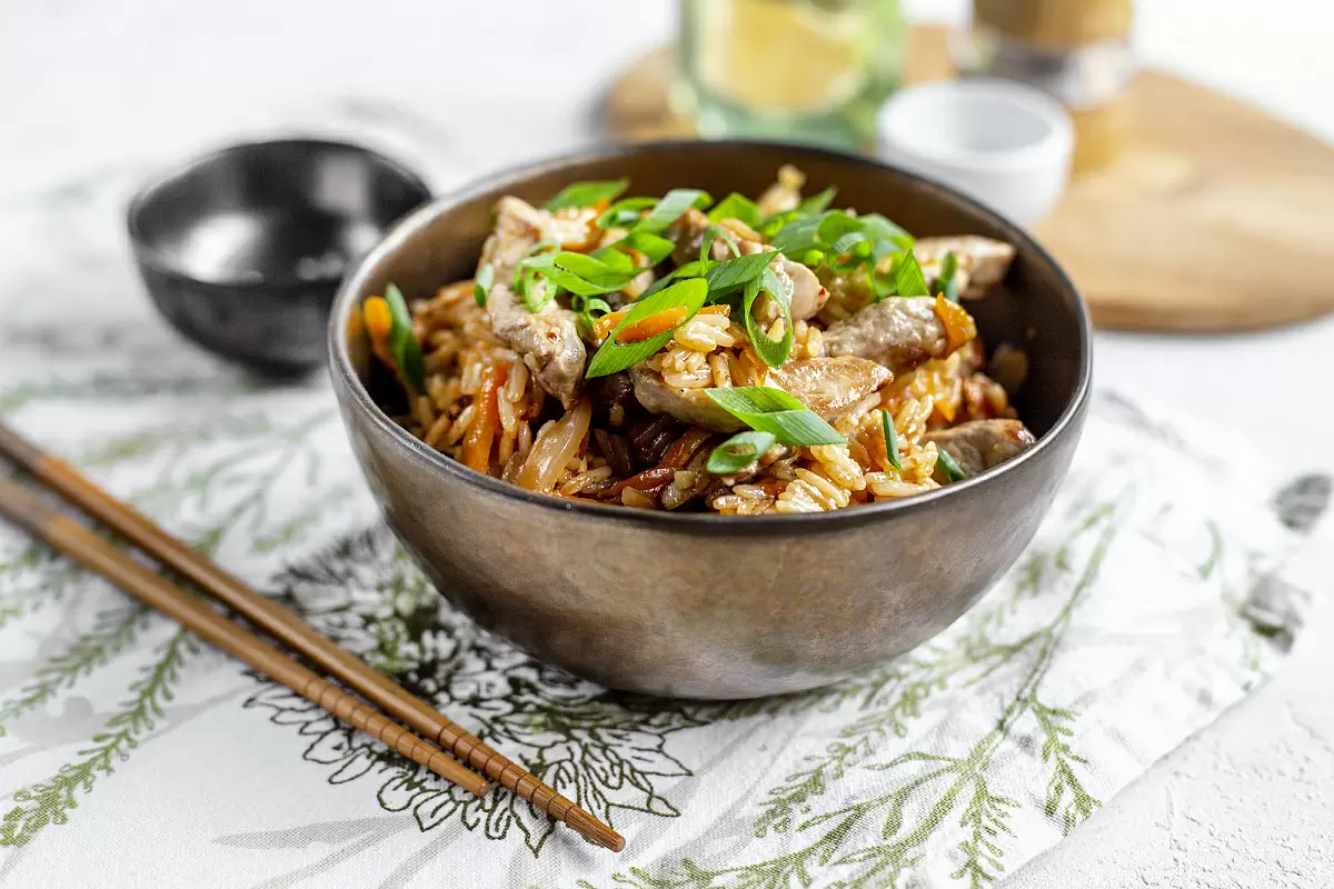 Рис жасмин не требует промывания перед варкой. Вскипятите 4-5 стаканов подсоленной воды в большой кастрюле. Убавьте огонь и добавьте рис, варите на среднем огне 10-12 минут. Готовность риса можно проверить на вкус. Затем откиньте его на дуршлаг и промойте теплой водой, чтобы избавиться от лишней клейкости. Пока варится рис, подготовьте мясо и овощи: нарежьте сладкий перец и красный лук соломкой, а морковь — натрите на крупной терке. Чеснок мелко порубите. Разогрейте сковороду с кунжутным маслом и 1 столовой ложкой растительного масла. Обжаривайте свинину на сильном огне в течение 5-7 минут, постоянно помешивая. Не забудьте нарезать чили, но будьте осторожны — острый перец требует аккуратности в обращении!