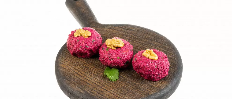 Свеклу можно отварить до готовности (время зависит от ее размера) или использовать уже готовую, купленную в магазине. Также отварить капусту в течение 40–60 минут.Пропустить овощи через мясорубку. Орехи измельчить с помощью блендера или натереть на терке, а кинзу мелко порубить.Смешать все ингредиенты, добавить специи, давленный чеснок, уксус и тщательно перемешать.Сформировать из массы шарики одинакового размера и подать, украсив орехами или зернами граната.Бургеры из моркови, семян и сала с свеклой