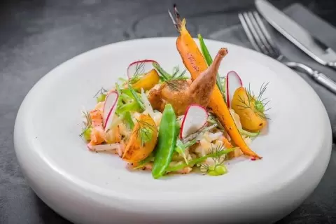 Бренд-шеф ресторана Uhvat, Виктор Белей, представил изысканную версию новогоднего салата Оливье, которая вобрала в себя все лучшие традиции. В этом рецепте перепелка, раковые шейки и черная икра гармонично сочетаются с другими ингредиентами, что создает уникальный вкус и атмосферу праздника. Чтобы усилить аромат, Виктор использует специальную четверговую соль, приготовленную самостоятельно по всем канонам.