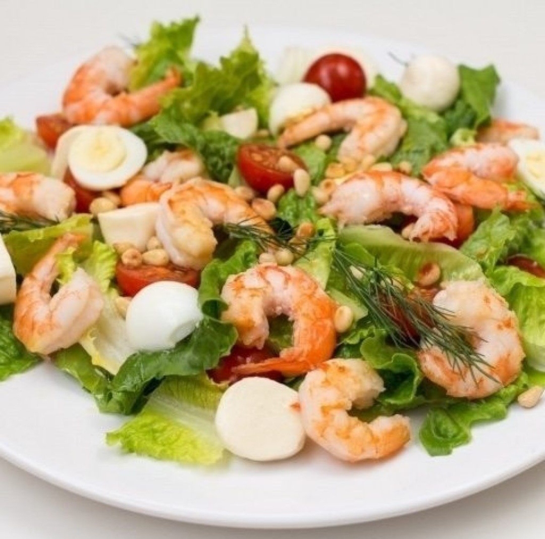 Приготовление начинается с варки перепелиных яиц, которые затем очищаются и нарезаются пополам. Свежие огурцы и помидоры нарезаются ломтиками, а листья салата — полосами. Все ингредиенты соединяются в одной миске и заправляются оливковым маслом с соевым соусом, первоклассный подъем блюда обеспечен красивой подачей с половинками яиц сверху. Креветки очищаются и жарятся на сковороде с поджаренным чесноком, а затем выкладываются на салат.