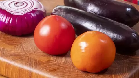 Начните с подготовки баклажанов, которые нужно частично очистить от кожицы, затем нарезать вдоль на две половины и разрезать крупными кубиками. Нарезанные овощи отправляют на раскалённую сковороду без масла, перемешивая время от времени до полной готовности.