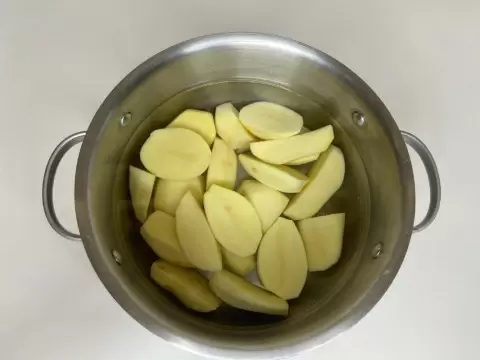 Чтобы сделать начинку, сначала необходимо отварить картошку. Для этого картофель следует очистить, нарезать на четвертинки и варить в подсоленной воде до готовности. Тем временем можно заняться луком — его нужно обжарить на растительном масле до получения карамельного оттенка.