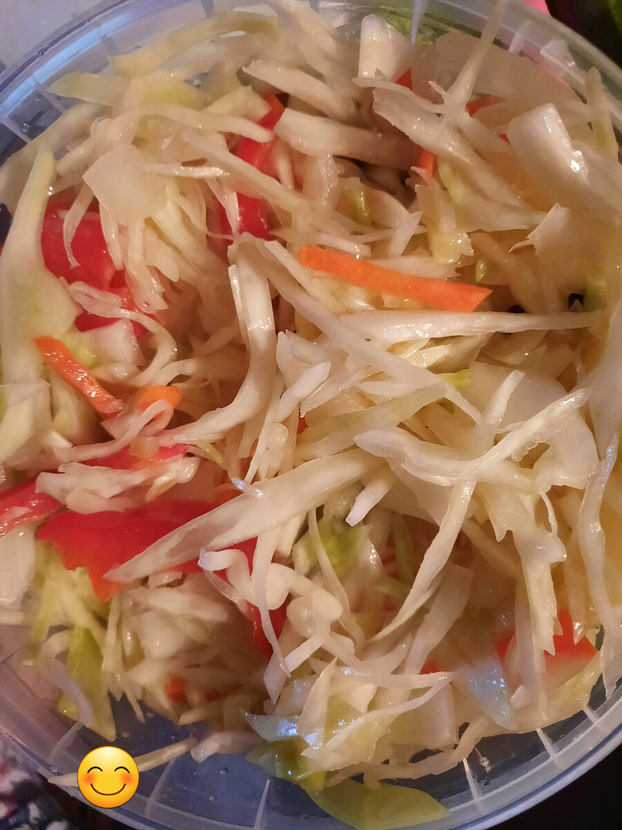 - Подготовка: Процесс начинается с того, что капусту тонко шинкуют и помещают в глубокую миску. Засыпьте её солью, тщательно перемешайте и легонько помните, чтобы выделился сок. В это время нарежьте лук, натрите морковь и порежьте перец, добавив всё это к капусте, после чего полейте смесь уксусом и маслом и добавьте горошины перца.