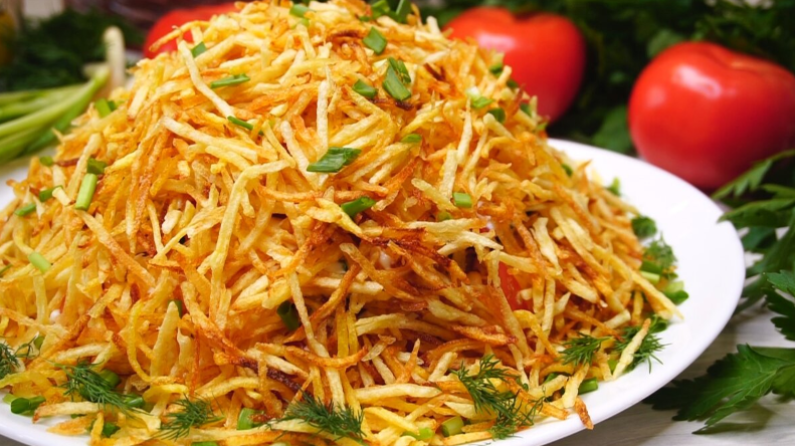 Сначала стоит подготовить картофель: его необходимо очистить и натереть на терке для корейской моркови. Далее, следует тщательно промыть стружку в холодной воде и обсушить на бумажных полотенцах. В сковороде разогреть растительное масло и обжаривать картофель до золотистого цвета, готовя небольшими порциями.