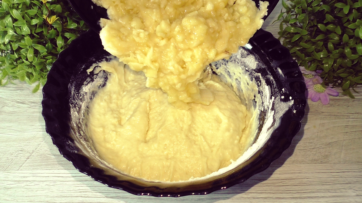 В глубокой миске комбинируются сметана, яйца, сахар и соль. Смесь хорошо взбивается до однородной структуры. Затем добавляется растительное масло, а после постепенно — просеянная мука и разрыхлитель. Тесто должно быть густым, но эластичным. Пришло время добавить бананы, которые следует разомните до состояния пюре и вмешайте в тесто.