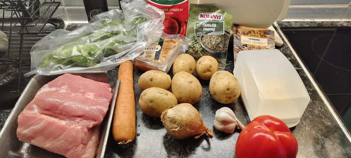 1. Подготовка ингредиентов: Мясо нарезают на порционные кусочки, картофель и морковь очищают. Лук рубится кубиком.