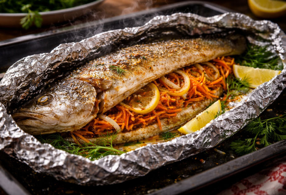 Запеченный судак в фольге — это идеальный вариант для тех, кто ищет сочетание легкости и насыщенных вкусов. Ароматная овощная начинка придает блюду пикантность, а корейская морковь (250 г) добавляет остроты. Такой подход позволяет сохранить сочность рыбы без необходимости в большом количестве масла. Это блюдо прекрасно украсит как повседневный ужин, так и праздничный стол.