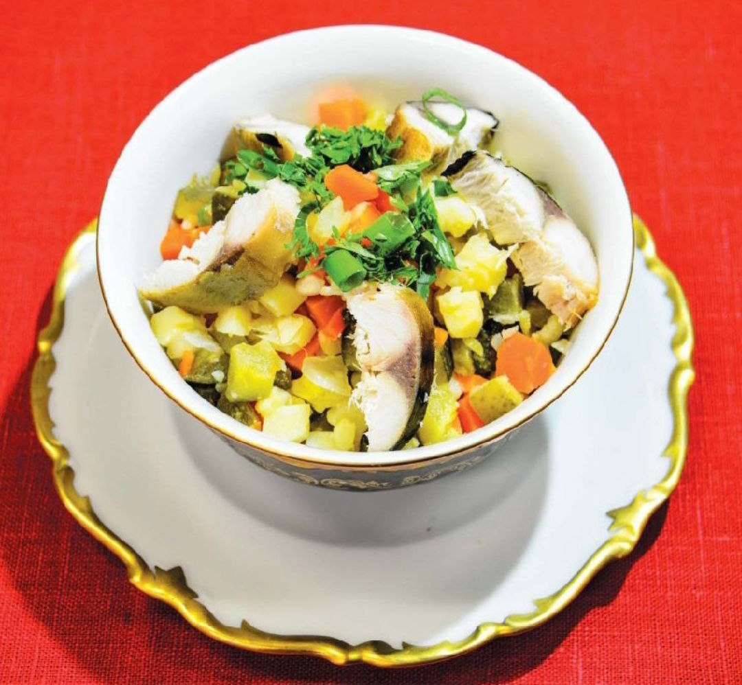 Сначала отварите картофель и морковь в мундире, остудите, очистите и нарежьте кубиками. Филе скумбрии и огурцы также порежьте. Репчатый лук нужно мелко нарезать и ошпарить кипятком. Смешайте все ингредиенты, добавьте горошек, приправьте майонезом, солью и перцем. Подавайте салат охлажденным, украсив свежей зеленью.