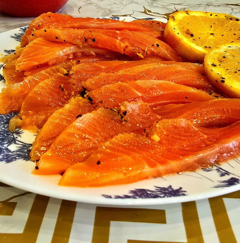 Как альтернатива, можно использовать смесь различных перцев: черного, белого, душистого, розового и зеленого, дополнив её базиликом или укропом. Важно использовать именно дробленные специи, чтобы они отдали все свои ароматы. Рыбу кладем в глубокую посуду и сверху укладываем кружки нарезанного апельсина. Накрываем фольгой и оставляем в холодильнике на сутки. При необходимости, приготовленный гравлакс можно заморозить — он сохраняет свой вкус даже после этого.