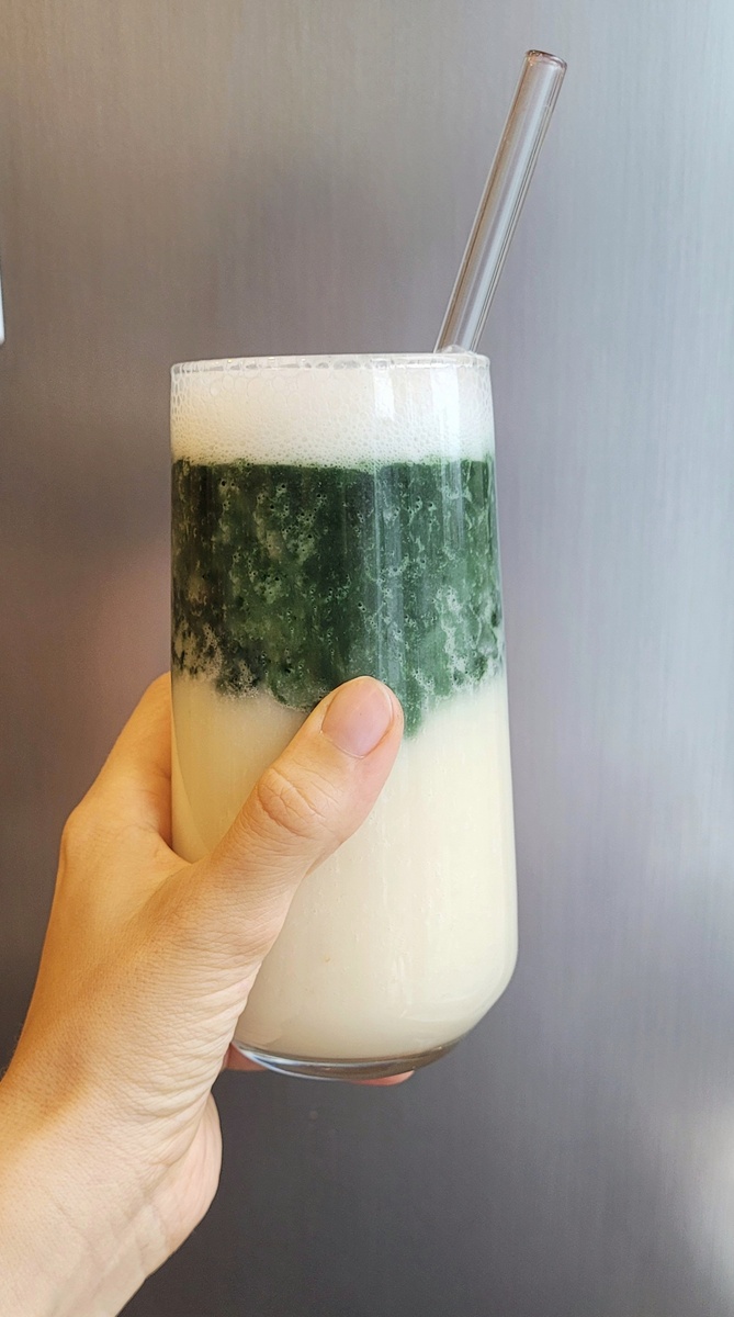 После этого половину полученного дынного молочка нужно вылить в бокалы, заполняя их не более чем на половину. Остальную часть молочка взбить в блендере с бананом, спирулиной и по желанию добавленным манго. При необходимости можно добавить воду для достижения желаемой консистенции. Для сладости подойдут мед или финики.