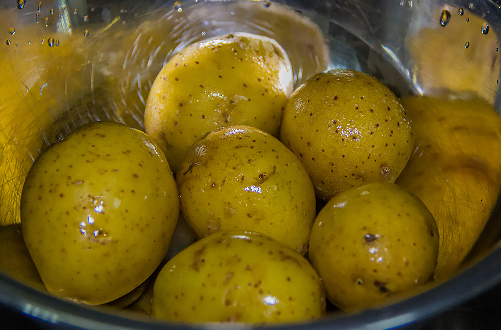 Первый шаг к идеальному гратену — это нарезка картофеля. Ломтики должны быть тоньше 3 мм: почти прозрачными. Если сделать их толще, они останутся жесткими внутри, тогда как тонкие ломтики станут приятной, кремовой массой. Желтый картофель предпочтителен, так как он лучше сохраняет свою текстуру при запекании и становится бархатистым.