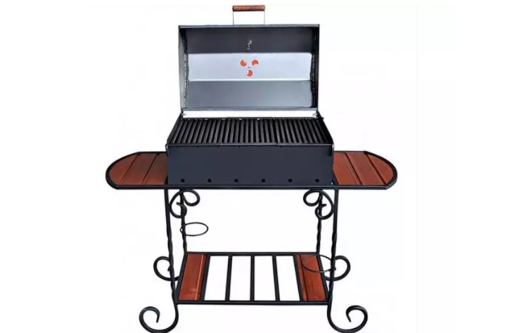 Жаровня предназначена для семи шампуров, которые надежно фиксируются в специально подготовленных прорезях. В боковых стенках предусмотрены вентиляционные отверстия для равномерной подачи воздуха. Мангал устанавливается на изящные кованые ножки, а под ним есть полочка, декорированная деревянными вставками.