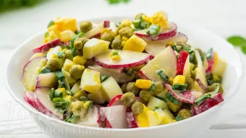 3. В глубокой миске смешайте нарезанный редис, лук, консервированный горошек и кубики яиц. По вкусу добавьте соль и перец, после чего заправьте 2-3 столовыми ложками сметаны. Тщательно перемешайте и подавайте к столу.