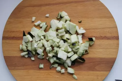 Для начала нагрейте сковороду с растительным маслом и нарежьте баклажан кубиками, отправив его на сковороду, чтобы избежать потемнения. Кабачки также нарезаются кубиком — они займут свое место в начинке, жарясь до готовности.