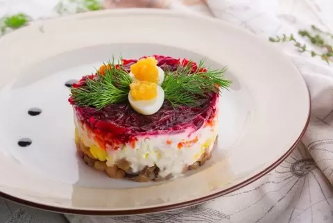 Когда блюдо наконец-то готово, его можно подать на стол, украсив веточкой зелени. Сельдь 'под шубой' станет отличным дополнением к любому праздничному столу и порадует своим неповторимым вкусом.