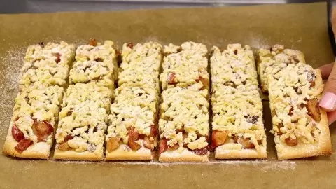 Большую часть теста раскатайте на пергаменте в прямоугольник размером 17х27 см. Убедитесь, что тесто не слишком тонкое, чтобы оно не ломалось после выпечки. Разложите начинку на тесто, затем натрите охлажденную часть теста на терке поверх начинки. Разрежьте заготовку на желаемые порции и выпекайте при температуре 180°C около 20 минут. После выпекания дайте печенью остыть и посыпьте сахарной пудрой.