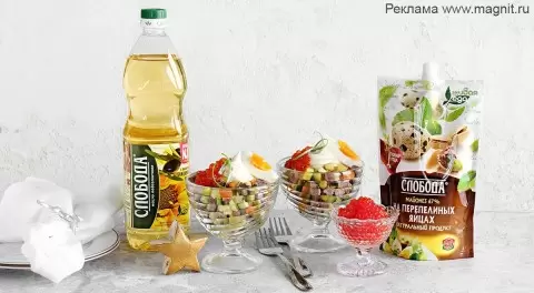 - Салат Оливье с говядиной, запечёнными овощами и икрой.