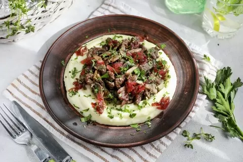 Шаг 3: На разогретой сковороде с растительным маслом обжарьте говядину с чесноком и тимьяном 3-4 минуты на сильном огне. Затем добавьте лук и шампиньоны, готовя еще 3-4 минуты на среднем огне. Подавайте блюдо, украсив свежей петрушкой и карамелизированным луком. Приятного аппетита!