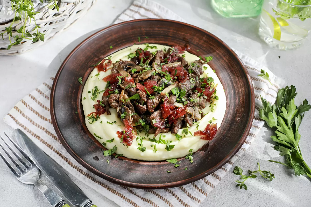 Говядина «Вечер в Бордо» — это не просто блюдо, а настоящий кулинарный шедевр, привносящий атмосферу французского шарма в каждую тарелку. Основу этого блюда составляет мягкая говядина, которая великолепно сочетается с карамелизированным луком и обжаренными шампиньонами, создавая гармонию вкусов на подушке из нежного картофельного пюре.