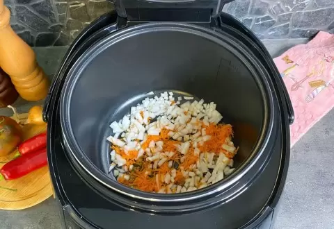 - Обжарка овощей: Включив режим «Жарка» на 15 минут, в чашу мультиварки добавляется растительное масло, нарезанный лук и натертая морковь. Овощи обжариваются до мягкости, что придаст блюду аромат и насыщенный вкус.