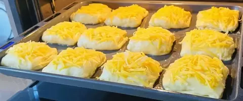Картошку и лук необходимо отварить и мелко нарезать. Подготовленную начинку выкладывают на разложенные слои теста. После этого каждый кусочек складывают пополам, создавая аккуратный пирожок. Полученные заготовки укладываются на противень, сверху посыпаются тертым сыром и ставятся в разогретую до 180 градусов духовку на 25-30 минут.