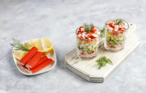 - Салат с крабовыми палочками: крабовые палочки, свежий огурец, яйца или сыр, кукуруза и майонез — все это отлично сочетается. Подавая в креманках, вы получите настоящий праздничный шедевр!