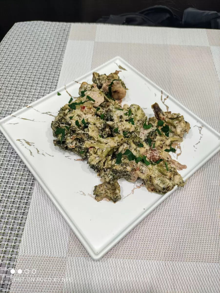 Приготовление начинается с обжарки мелко нарезанного лука на сливочном масле до прозрачного состояния. Затем в сковороду добавляется нарезанное кусочками куриное мясо, которое следует жарить в течение 5-6 минут. Далее, к мясу присоединяются соцветия брокколи и мелко порезанный чеснок.