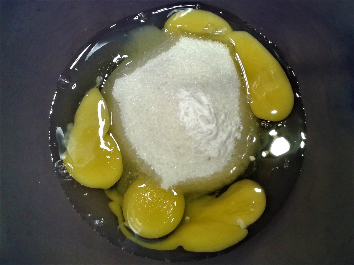 1. Начать стоит с растапливания маргарина. В глубокой миске разбить яйца, добавить сахар, соду и соль. Тщательно перемешать.