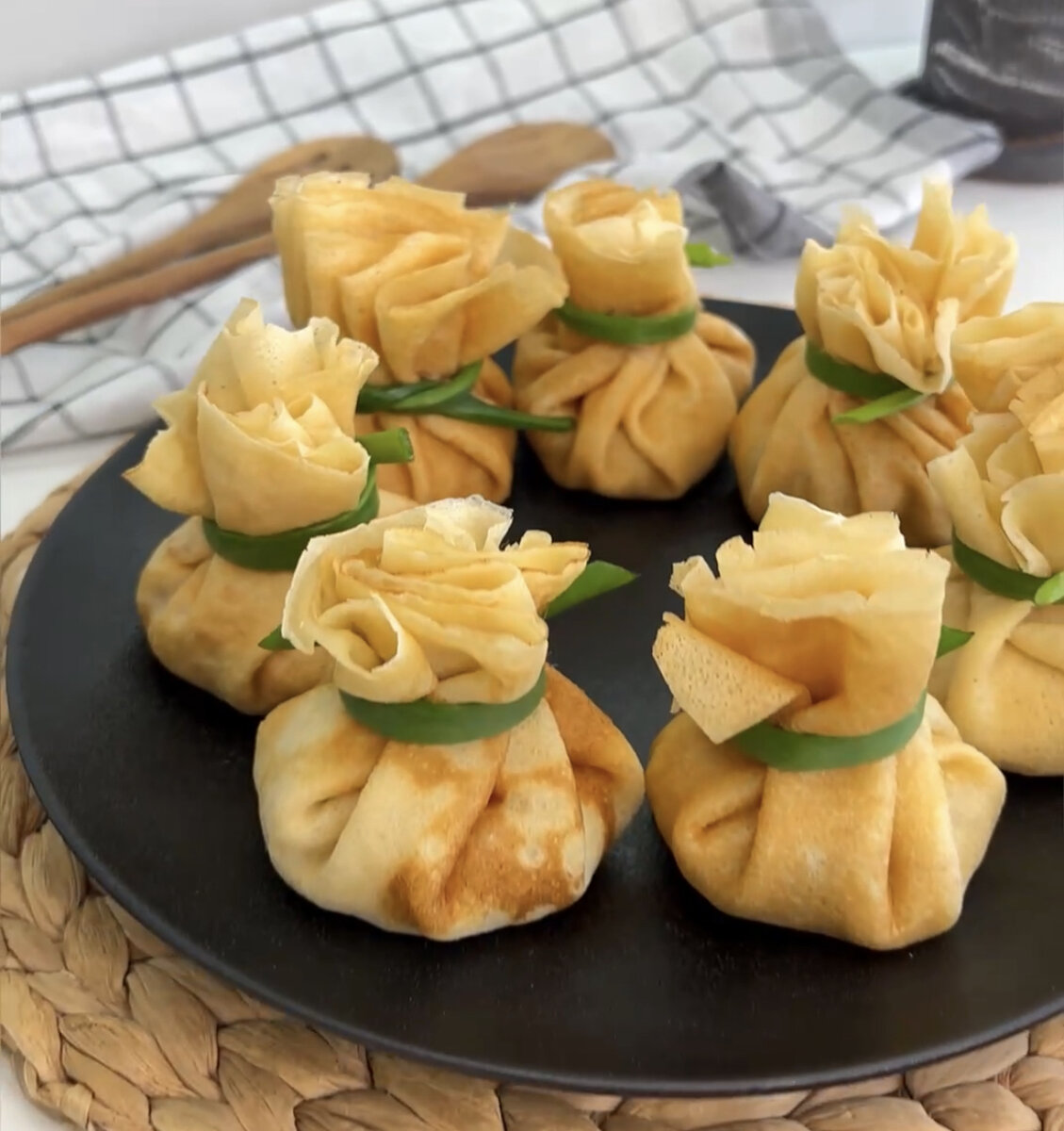 После того как блины и начинка готовы, пора собирать блюдо. На центр блина выкладывают ароматную начинку и аккуратно заворачивают края, создавая мешочек или конвертик. Специальным пером из лука можно закрепить блины, чтобы они не раскрылись.