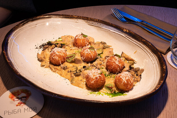 К этому блюду ресторан "Рыба Моя" подходят с особым вниманием, предлагая в качестве гарнира картофельные крокеты. Эти хрустящие шарики, обжаренные в кипящем масле, могут удивить своим контрастом: снаружи они хрустящие, а внутри нежные и мягкие.
